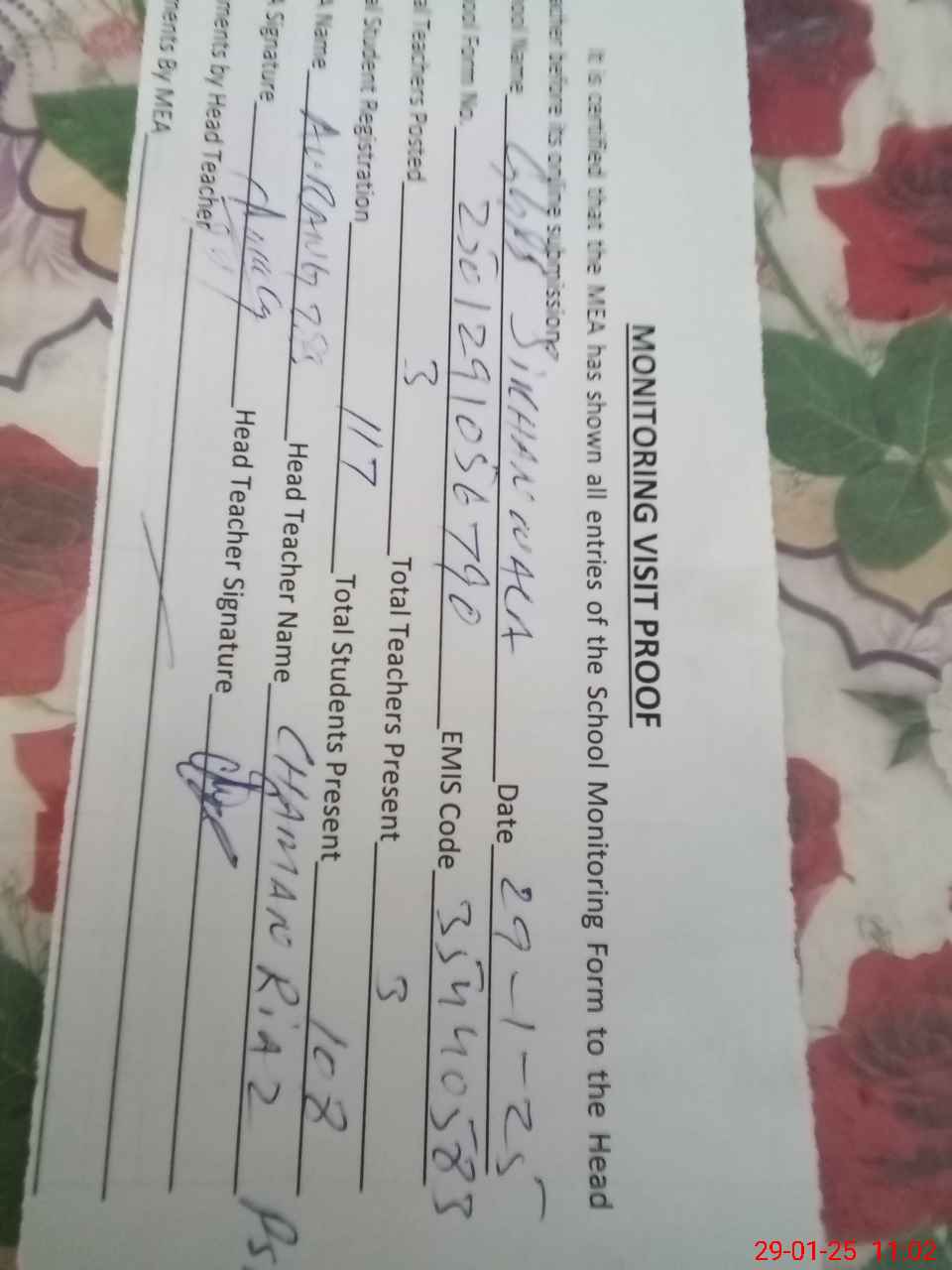 | Attendance Register | Head Teacher | MEA with School | Visit Proof |
