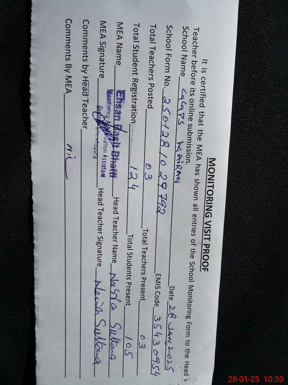 | Attendance Register | Head Teacher | MEA with School | Visit Proof |