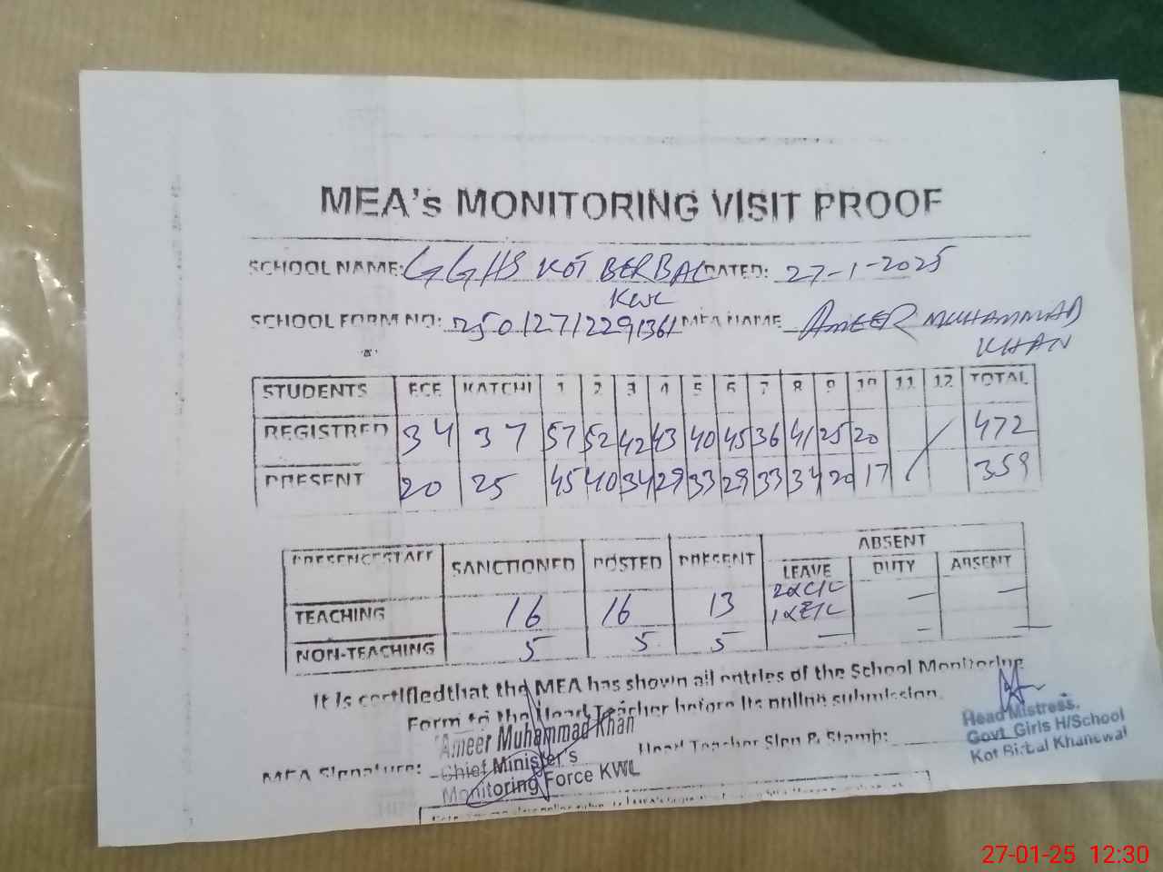 | Attendance Register | Head Teacher | MEA with School | Visit Proof |
