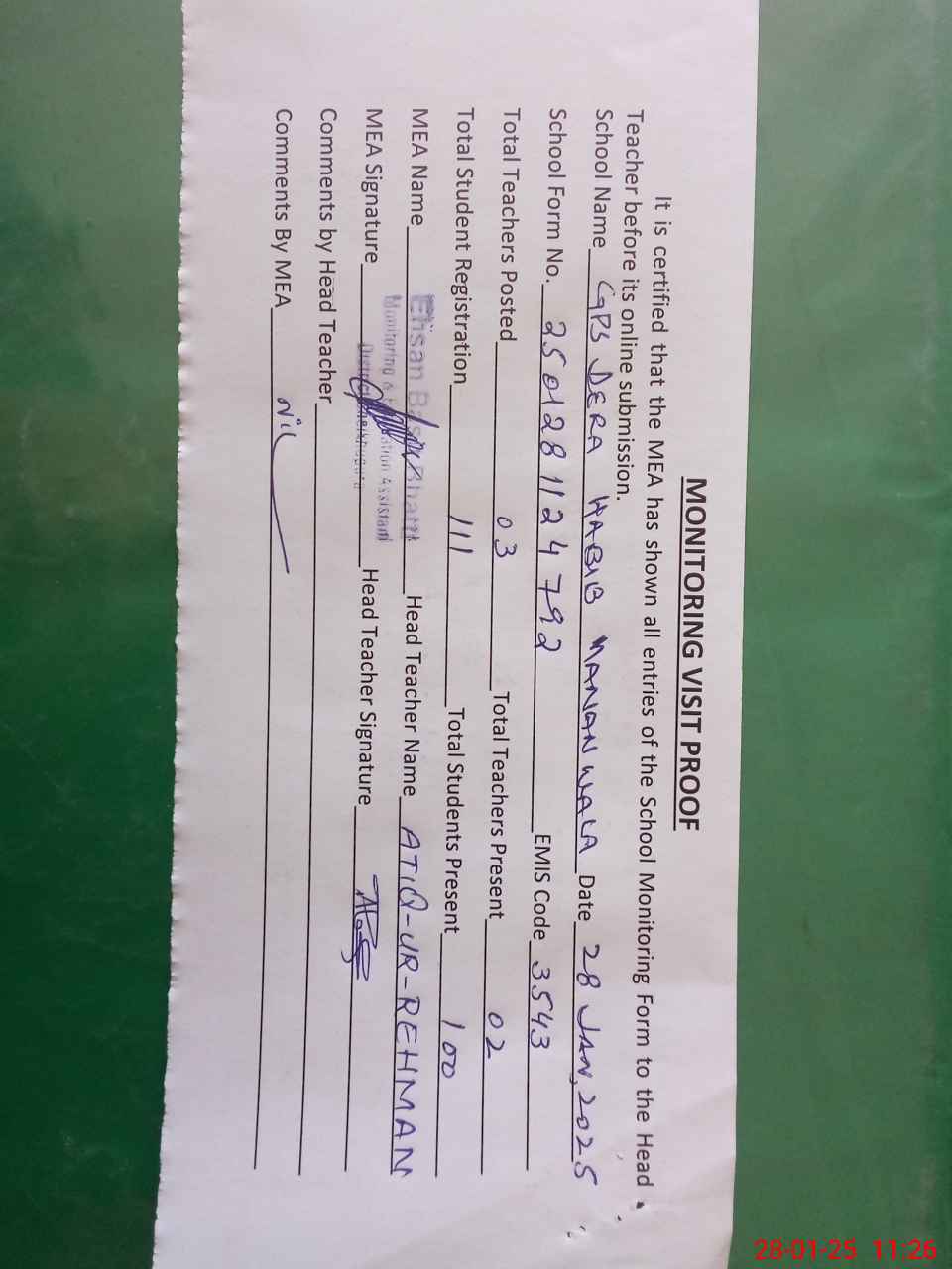 | EMIS Code: 35431117 | Name of School: GPS DERA HABIB MANANWALA | |||