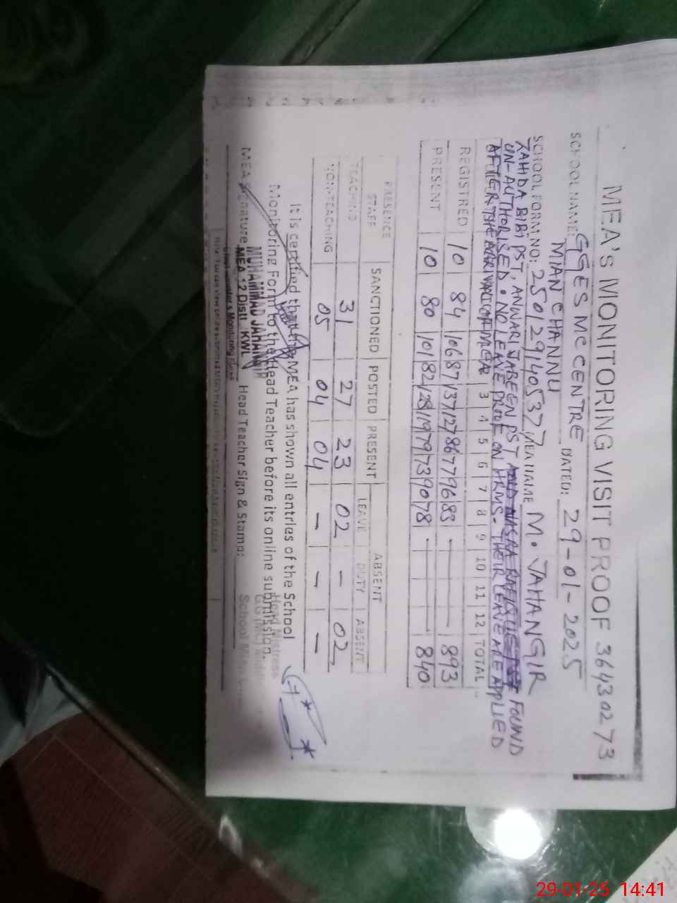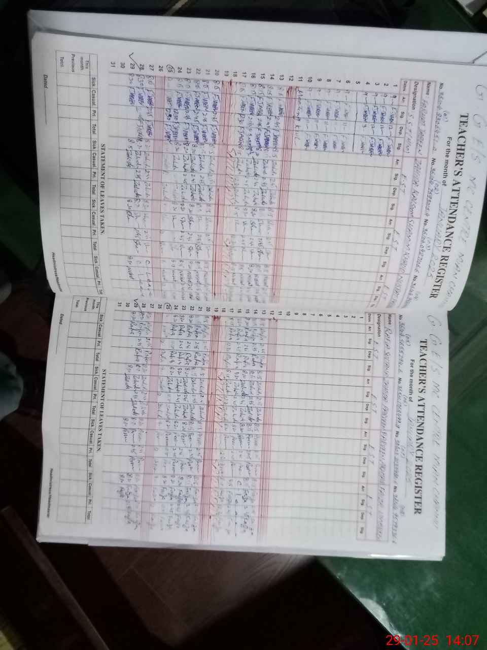 | Remarks (Use Separate Page if Required): ZAHIDA BIBI PST AND ANWARI JABEEN PST FOUND UN AUTHORISED ABSENT FROM DUTY NO CASUAL LEAVE PROOF IS AVAILABLE ON HRMS THEIR LEAVE ARE APPLIED AFTER THE ARRIVAL OF MEA ZAHIDA BIBI PST APPLIED ON 29 JANUARY 2025 AT 12 32 15 PM AND APPROVED AT 12 38 34 PM AND ANWARI JABEEN PST NO PROOF AVAILABLE NSB GRANTS RECORDS ARE NOT MAINTAINED RANDOM CLASS TWO IS NOW IN CLASS FIVE | |||||