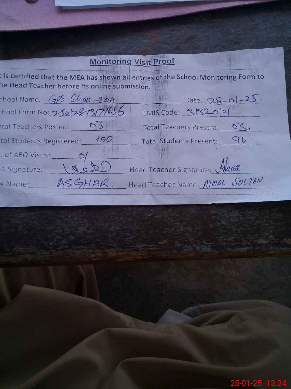 | Attendance Register | Head Teacher | MEA with School | Visit Proof |