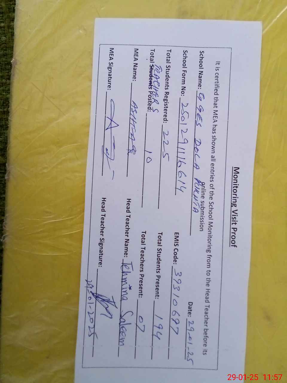 | Attendance Register | Head Teacher | MEA with School | Visit Proof |
