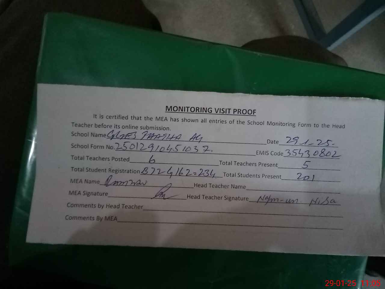 | Attendance Register | Head Teacher | MEA with School | Visit Proof |