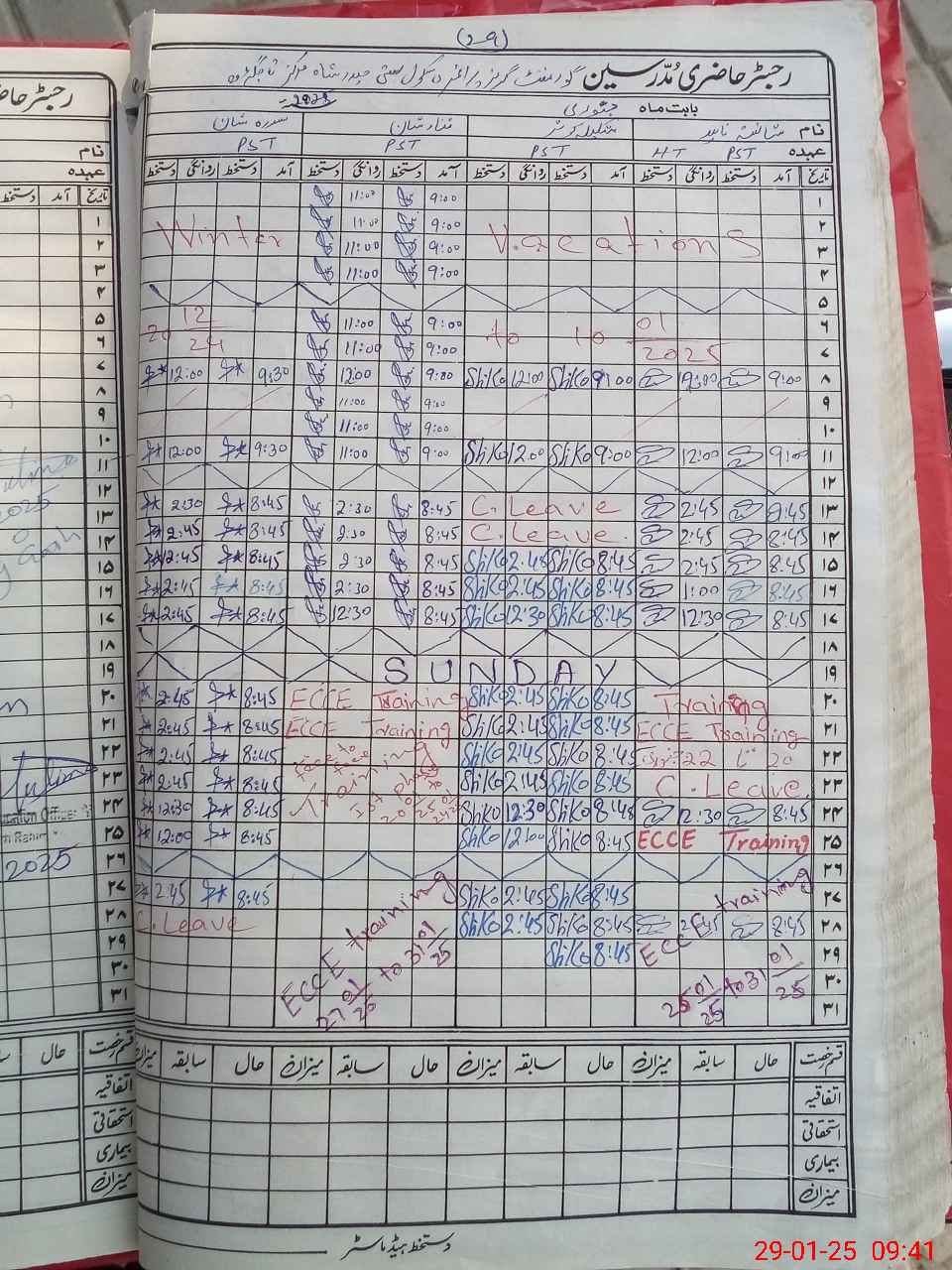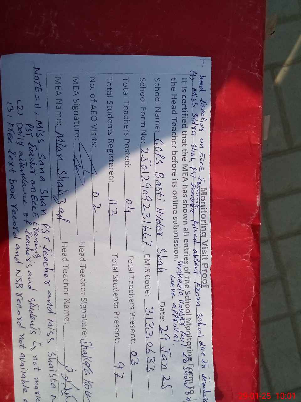 | Remarks (Use Separate Page if Required): 1 Miss Sana Shan PST teacher and miss Shaista Naheed PST teacher on ECCE training 2 Daily attendance of teachers and students is not marked on SIS 3 Free text books and NSB record not available due to head teacher on ECCE training 4 Miss Sidra Shan PST teacher found absent from school during school visit due to miss Shakeela Kousar PST teacher fail to show online leave approval | |||||