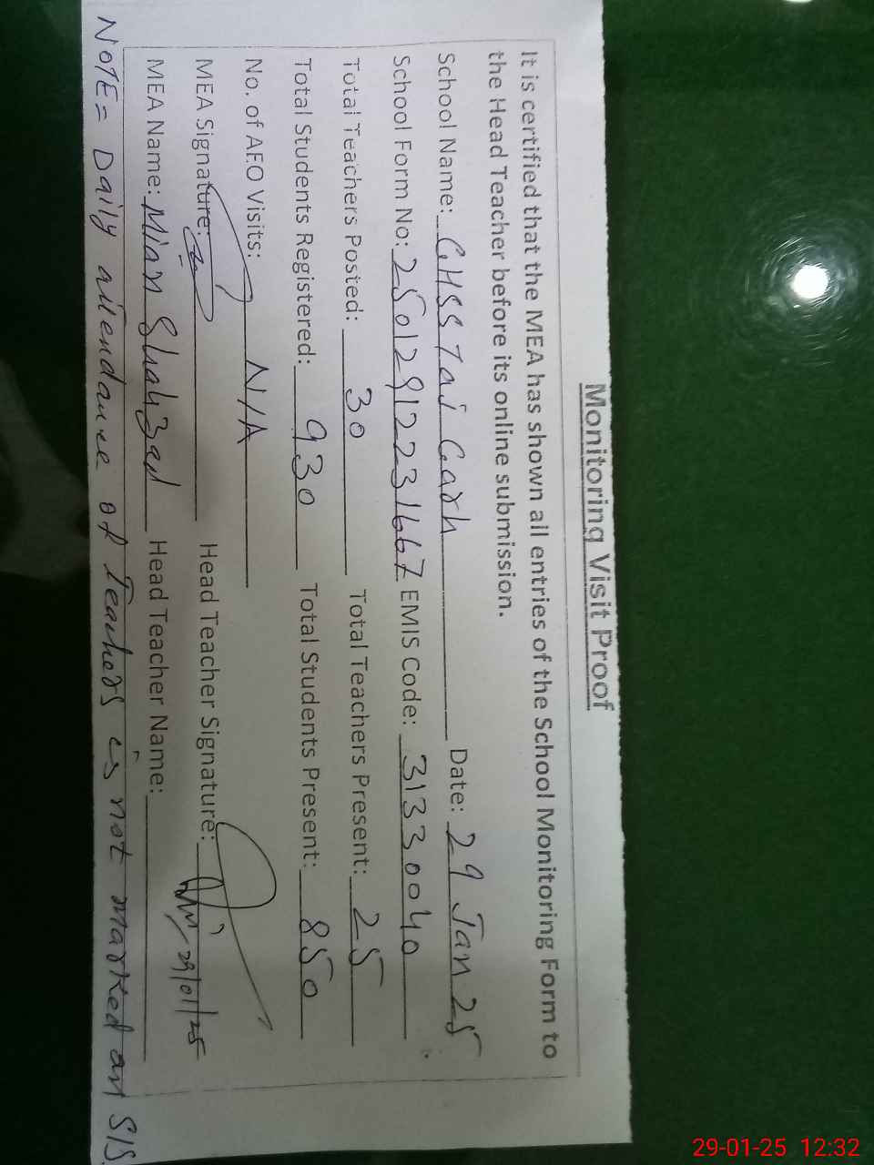 | Attendance Register | Head Teacher | MEA with School | Visit Proof |