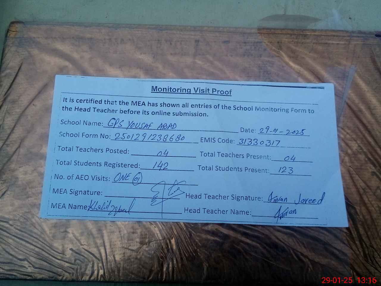 | Attendance Register | Head Teacher | MEA with School | Visit Proof |