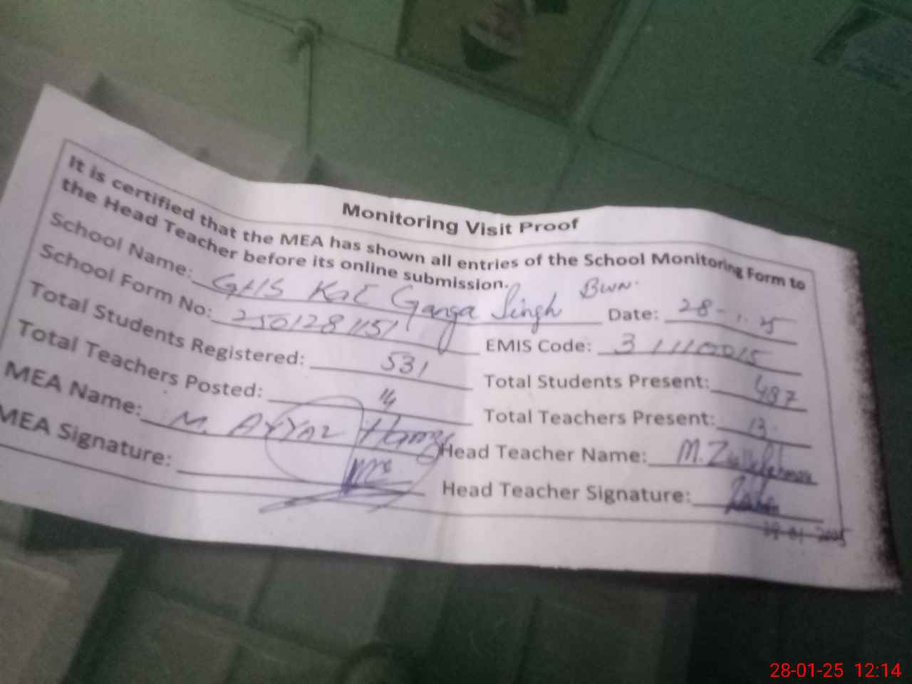 | Attendance Register | Head Teacher | MEA with School | Visit Proof |