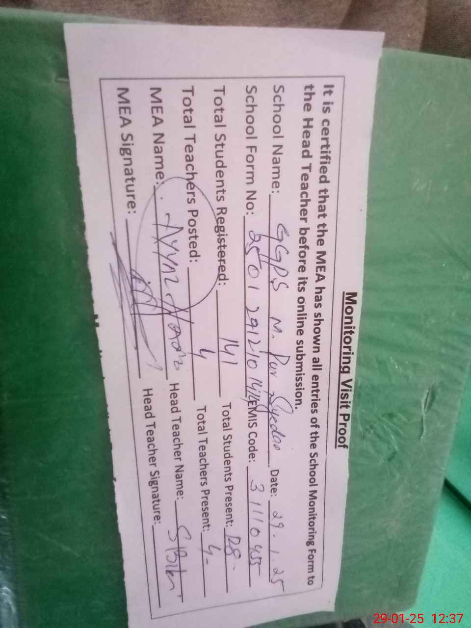 | Attendance Register | Head Teacher | MEA with School | Visit Proof |