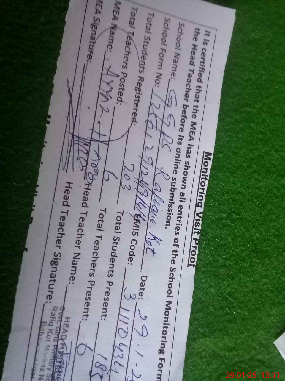 | Attendance Register | Head Teacher | MEA with School | Visit Proof |