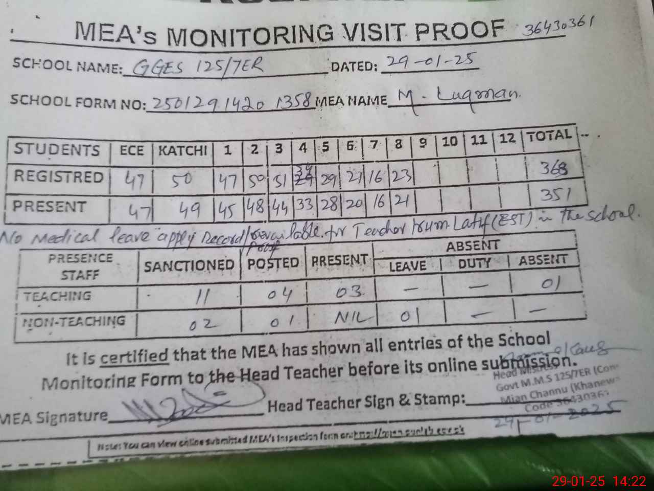 | Certified that this School was Inspected by the Undersigned MEA/DMO Today and the Information Stated Above is as Per Record. | |||||