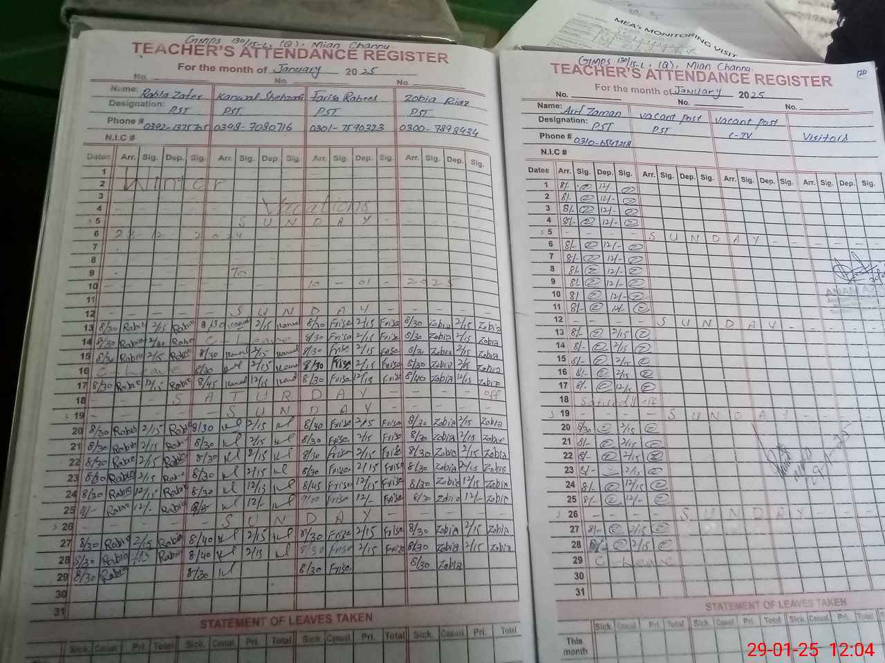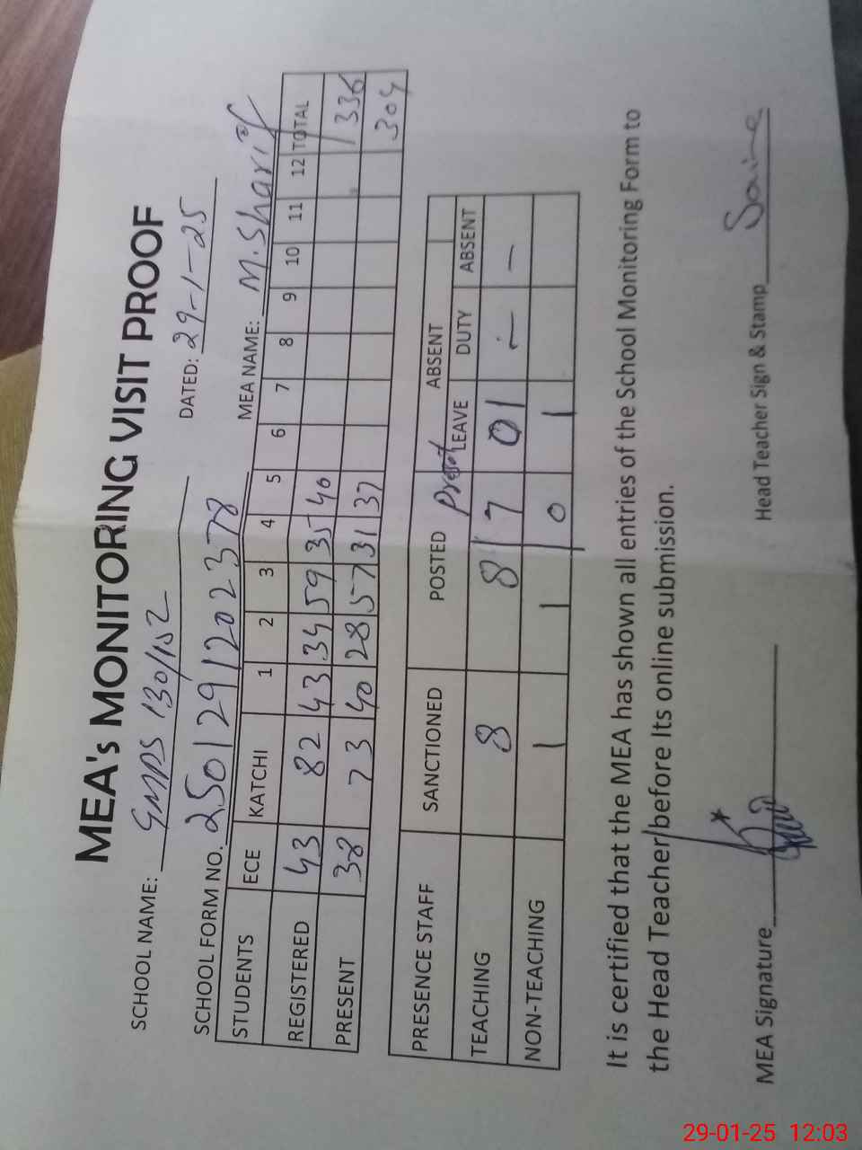 | Attendance Register | Head Teacher | MEA with School | Visit Proof |