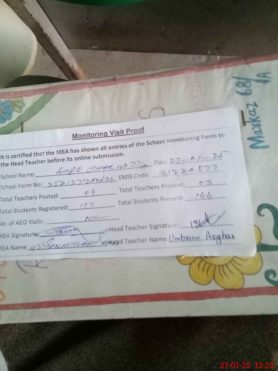 | Attendance Register | Head Teacher | MEA with School | Visit Proof |