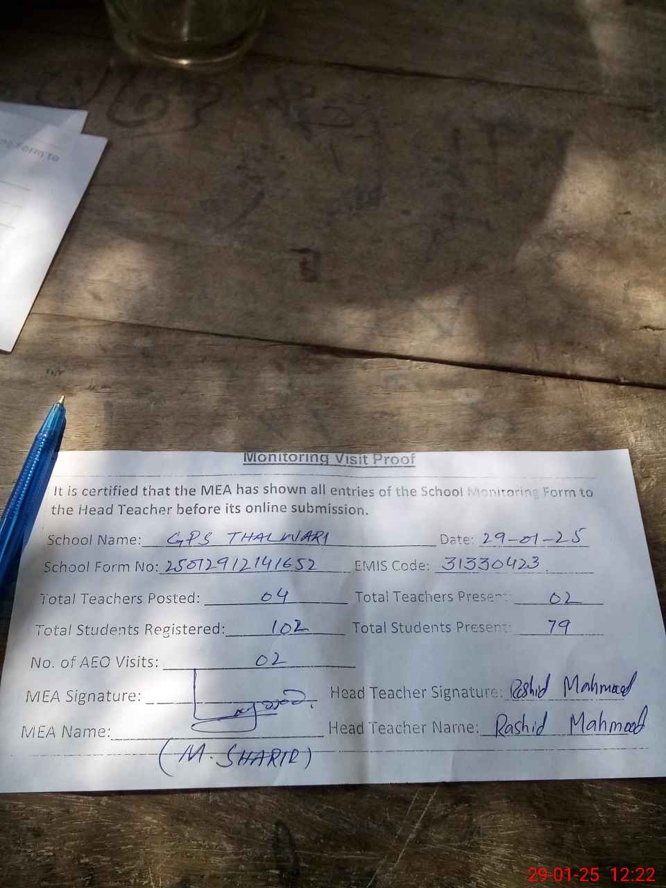 | Attendance Register | Head Teacher | MEA with School | Visit Proof |