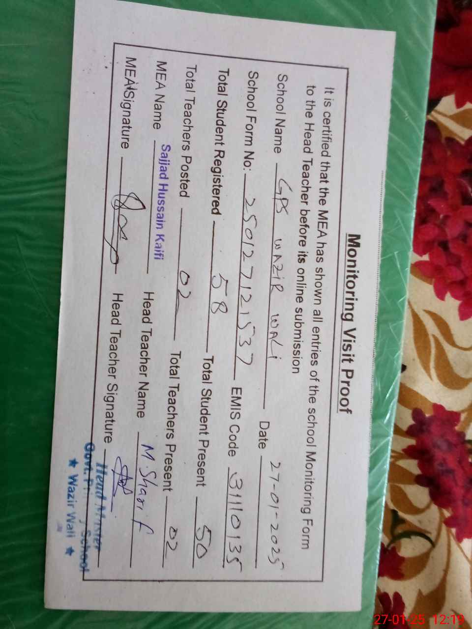 | EMIS Code: 31110135 | Name of School: GPS WAZIR WALI | |||