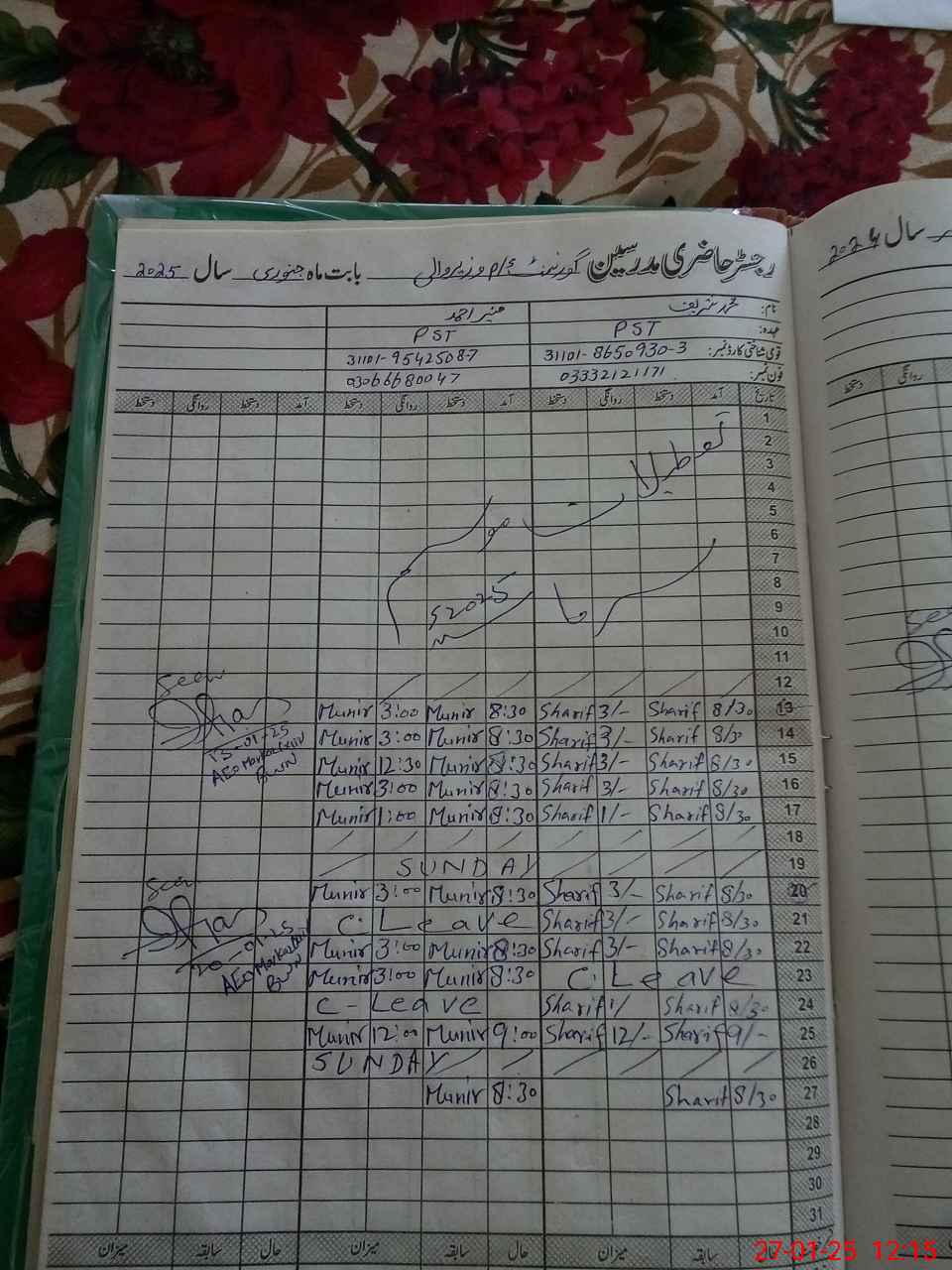 | CNIC | Full Name | Designation | R/C | Absence During Last Calender Month |