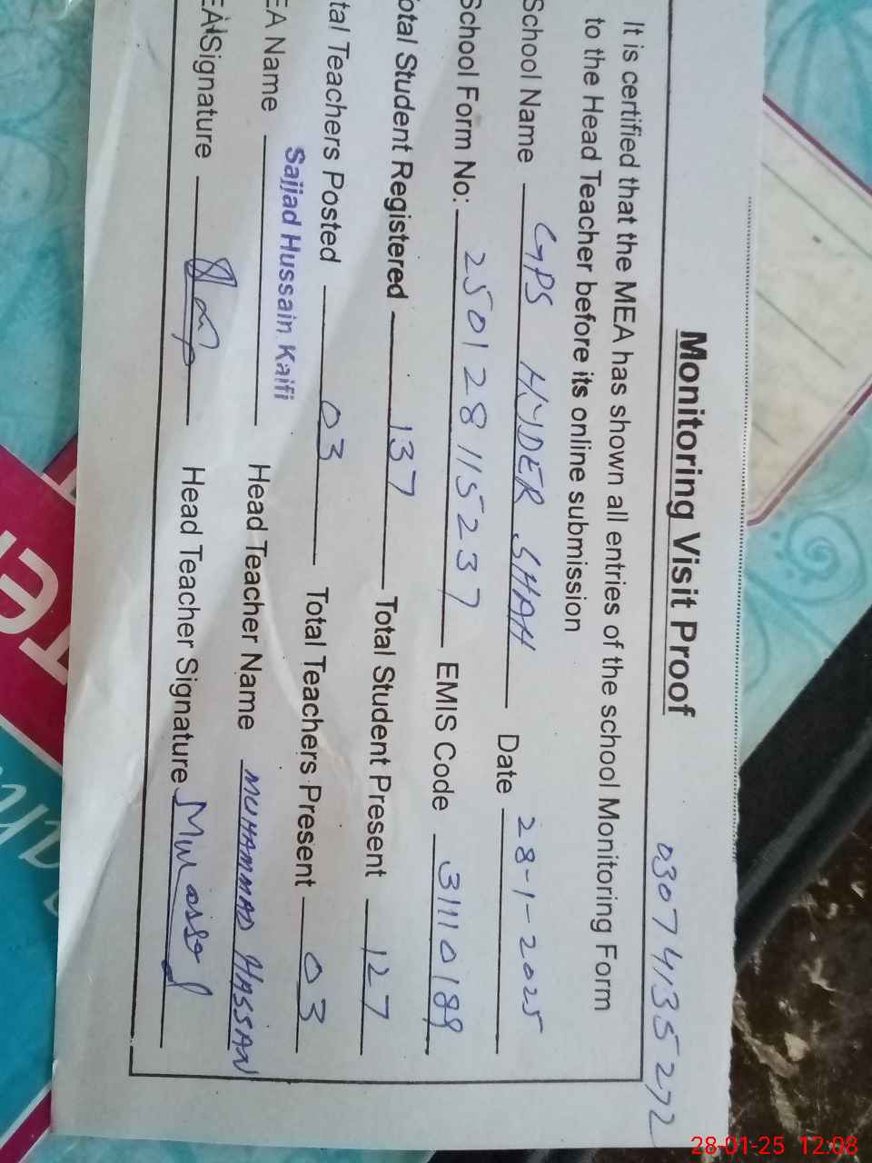 | EMIS Code: 31110189 | Name of School: GPS HAIDER SHAH | |||