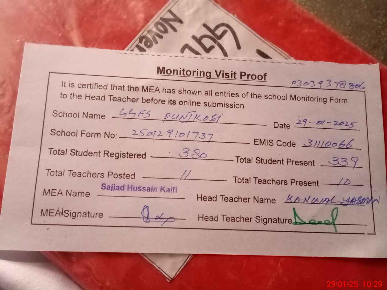 | Attendance Register | Head Teacher | MEA with School | Visit Proof |
