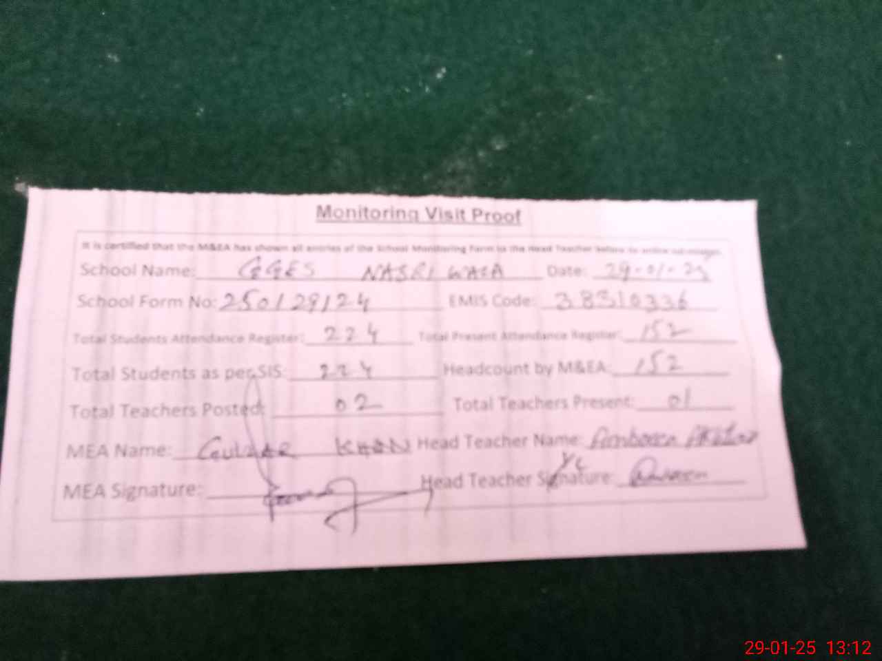 | Attendance Register | Head Teacher | MEA with School | Visit Proof |