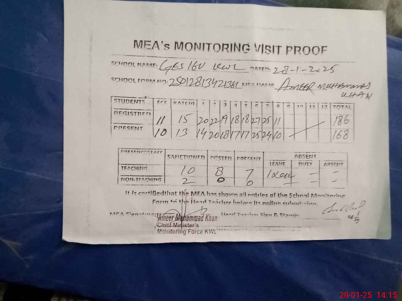 | Attendance Register | Head Teacher | MEA with School | Visit Proof |