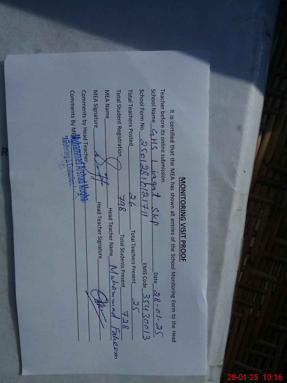 | Attendance Register | Head Teacher | MEA with School | Visit Proof |