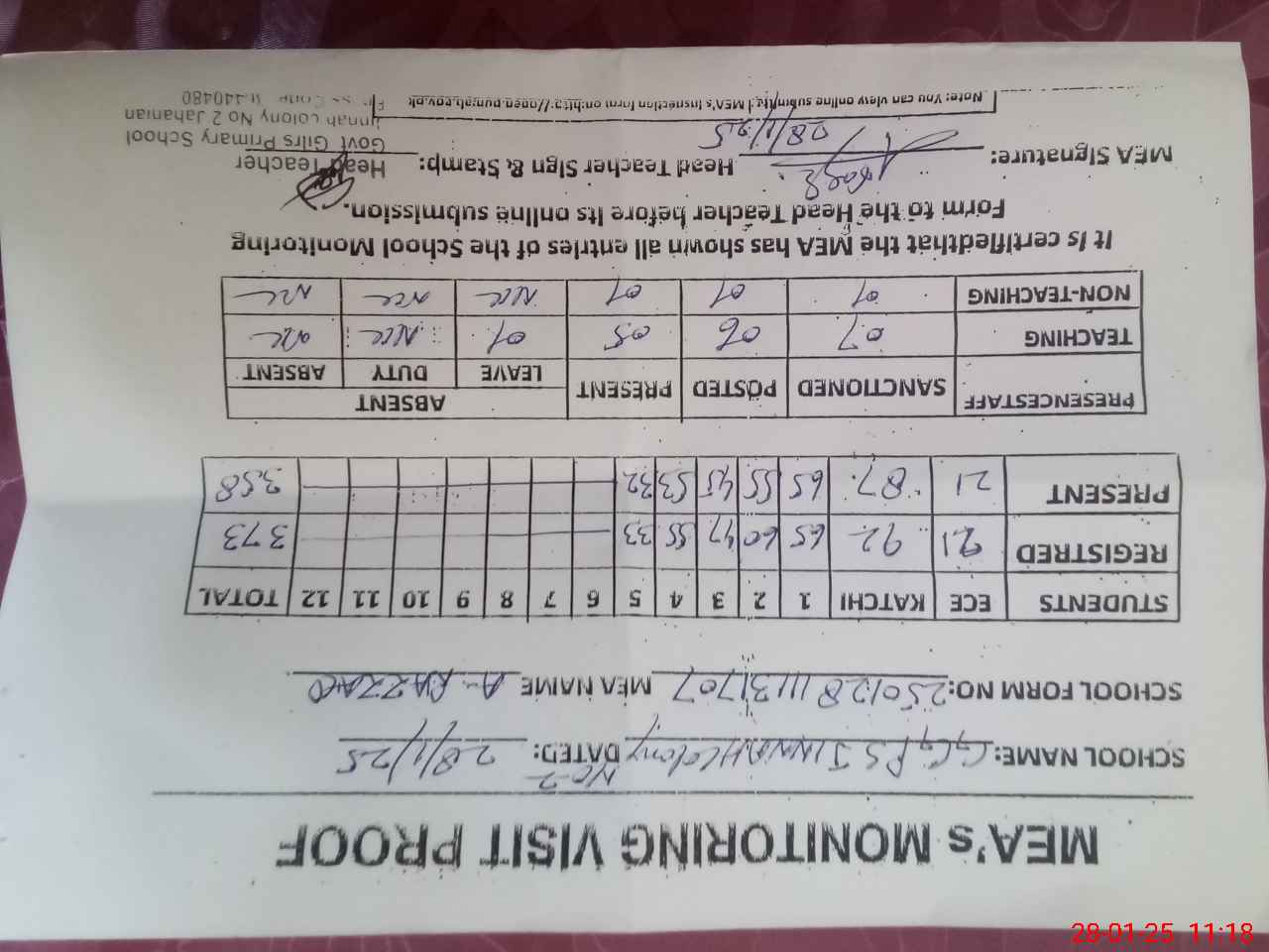 | Attendance Register | Head Teacher | MEA with School | Visit Proof |