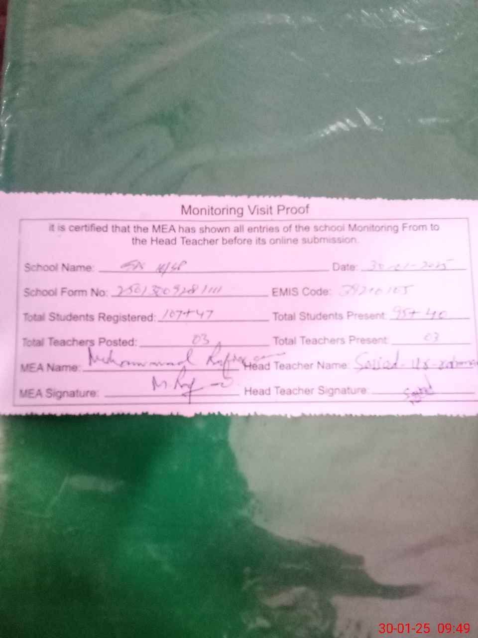| Certified that this School was Inspected by the Undersigned MEA/DMO Today and the Information Stated Above is as Per Record. | |||||