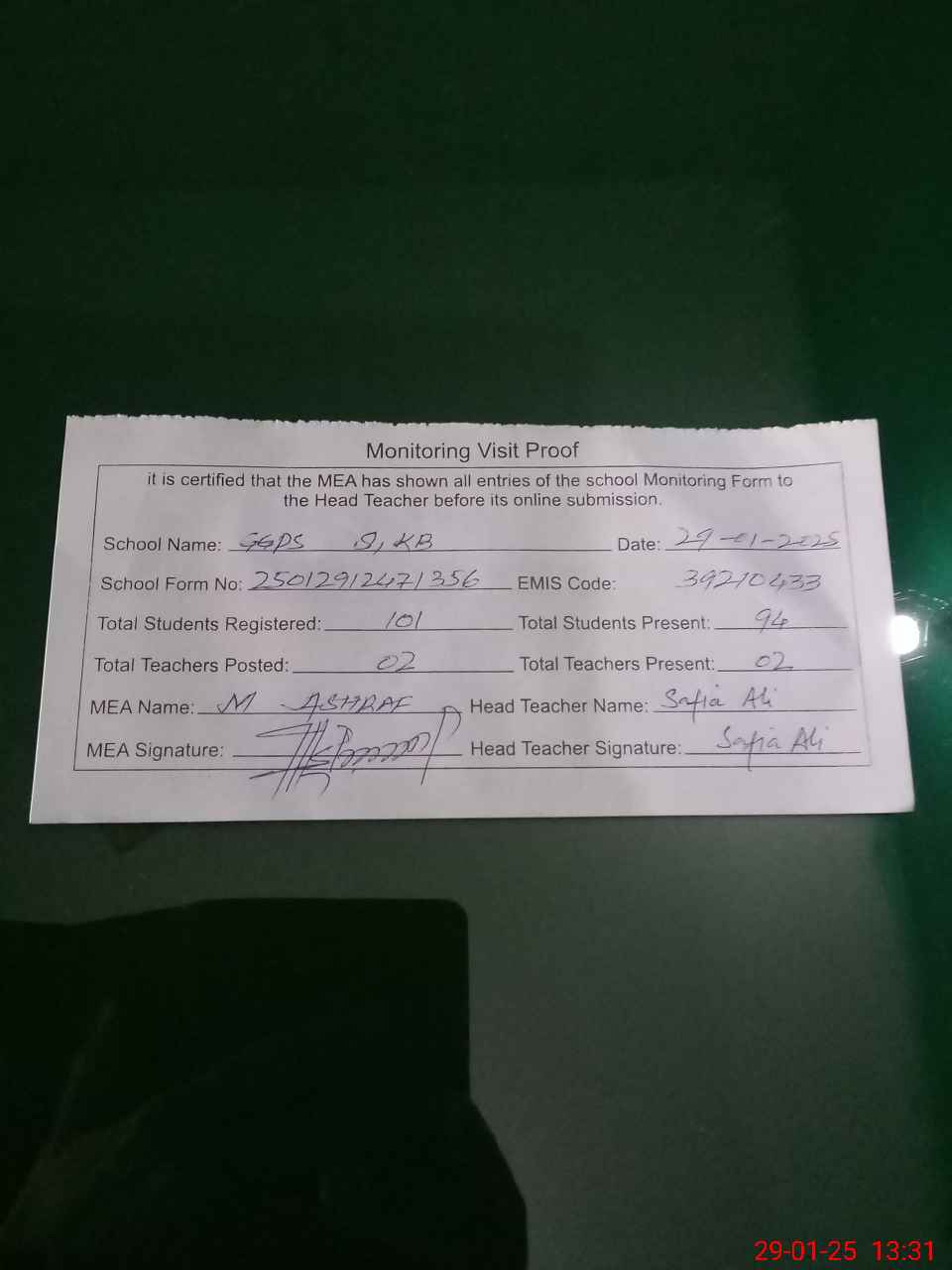 | Attendance Register | Head Teacher | MEA with School | Visit Proof |