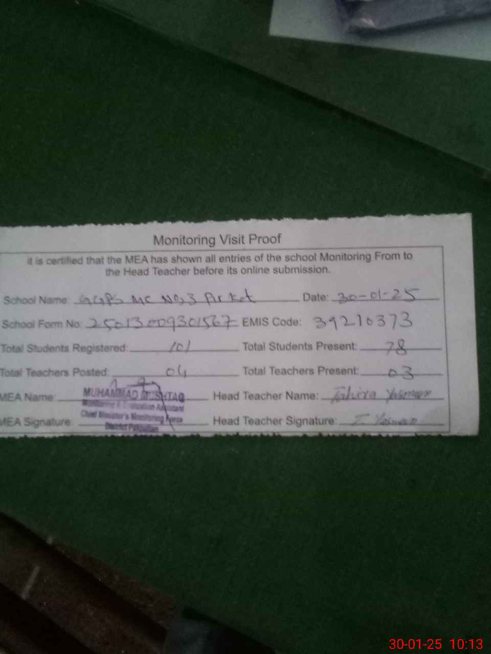 | Attendance Register | Head Teacher | MEA with School | Visit Proof |