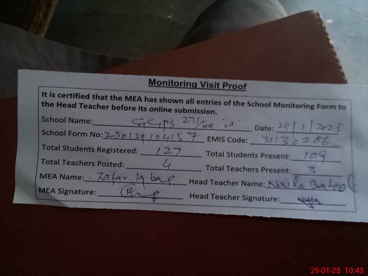| Attendance Register | Head Teacher | MEA with School | Visit Proof |