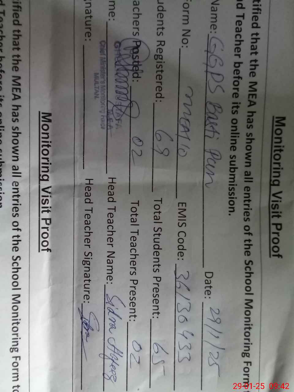 | Attendance Register | Head Teacher | MEA with School | Visit Proof |