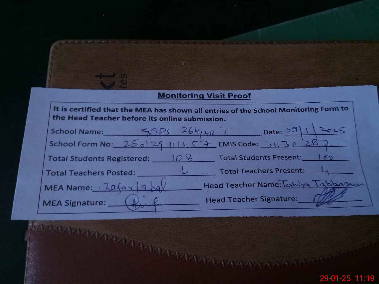 | Attendance Register | Head Teacher | MEA with School | Visit Proof |