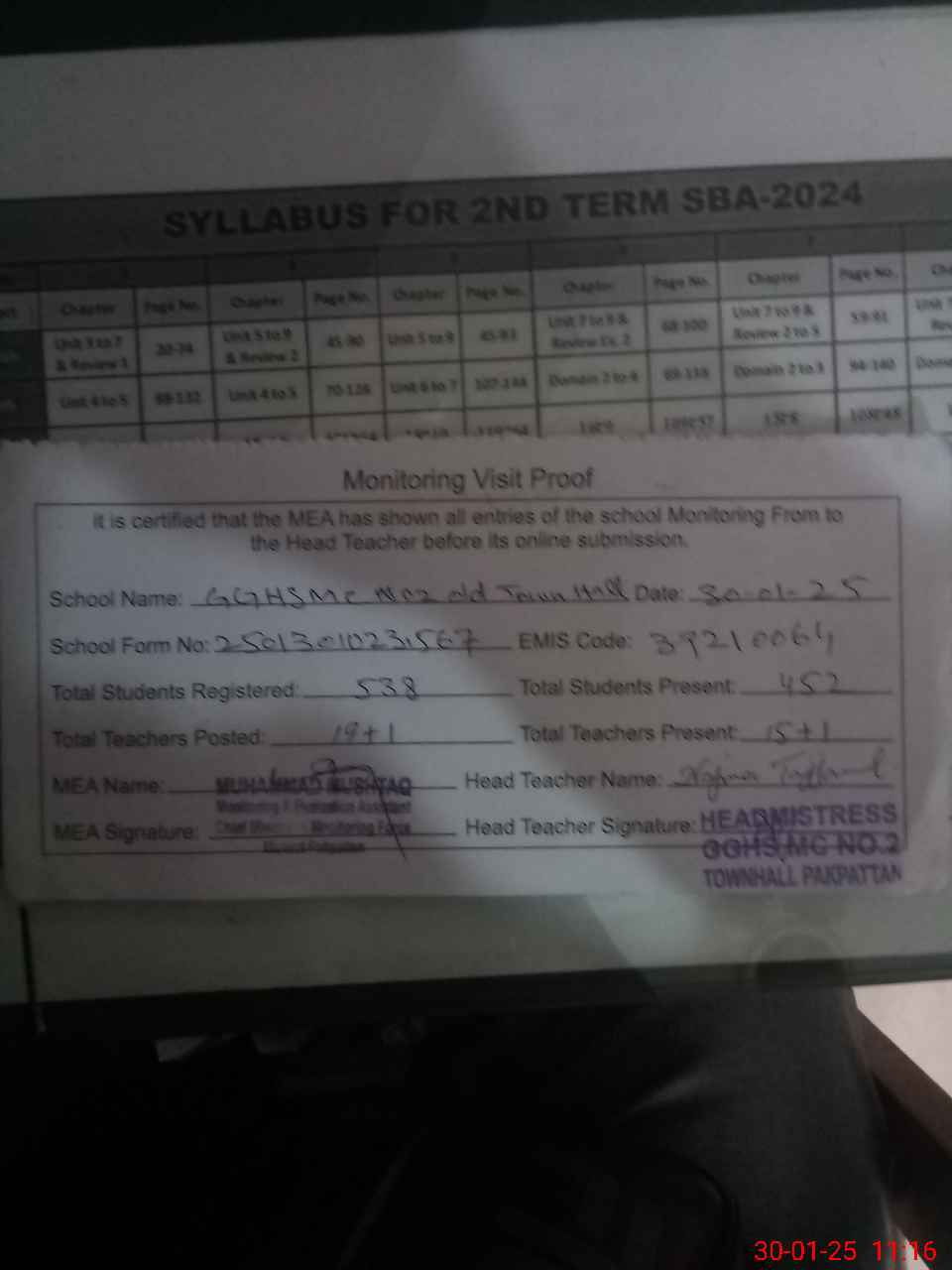 | Certified that this School was Inspected by the Undersigned MEA/DMO Today and the Information Stated Above is as Per Record. | |||||