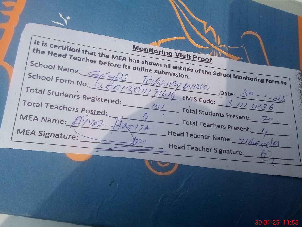| Attendance Register | Head Teacher | MEA with School | Visit Proof |