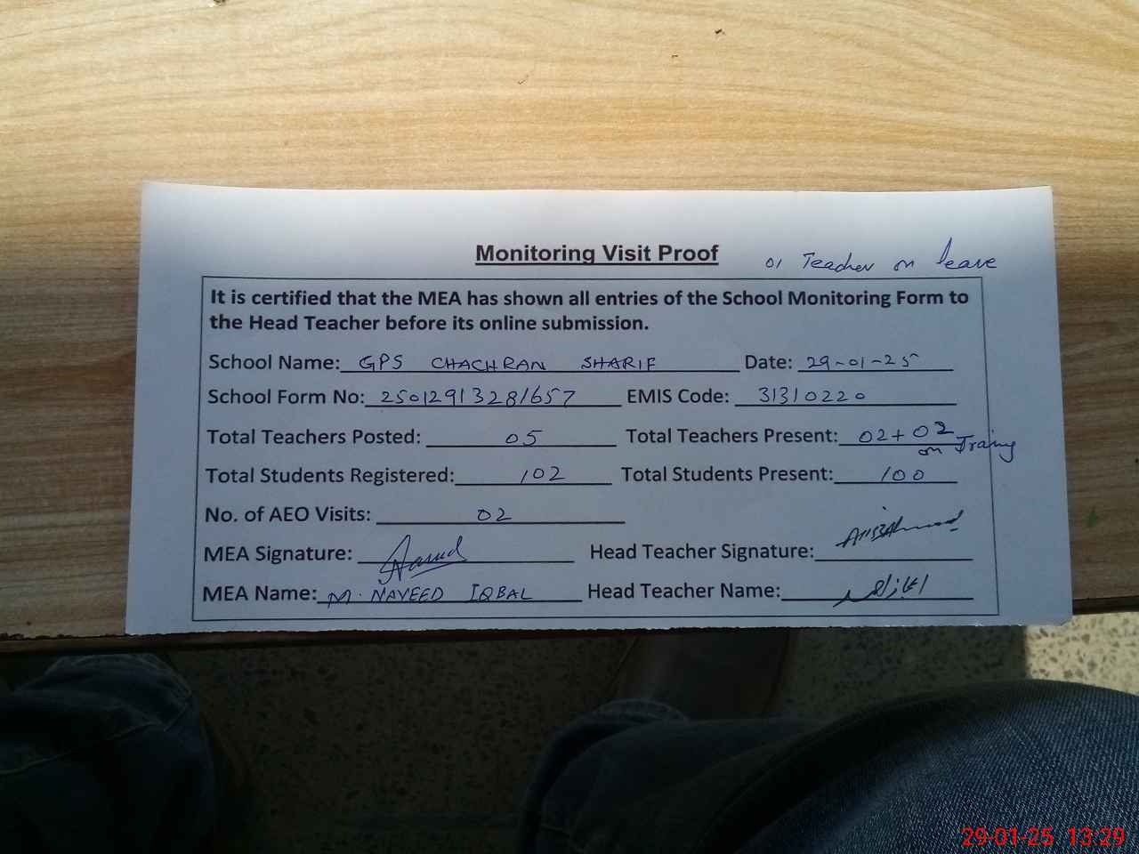 | Attendance Register | Head Teacher | MEA with School | Visit Proof |