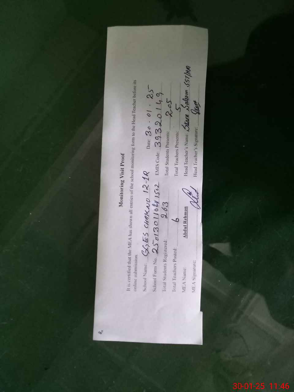 | Attendance Register | Head Teacher | MEA with School | Visit Proof |