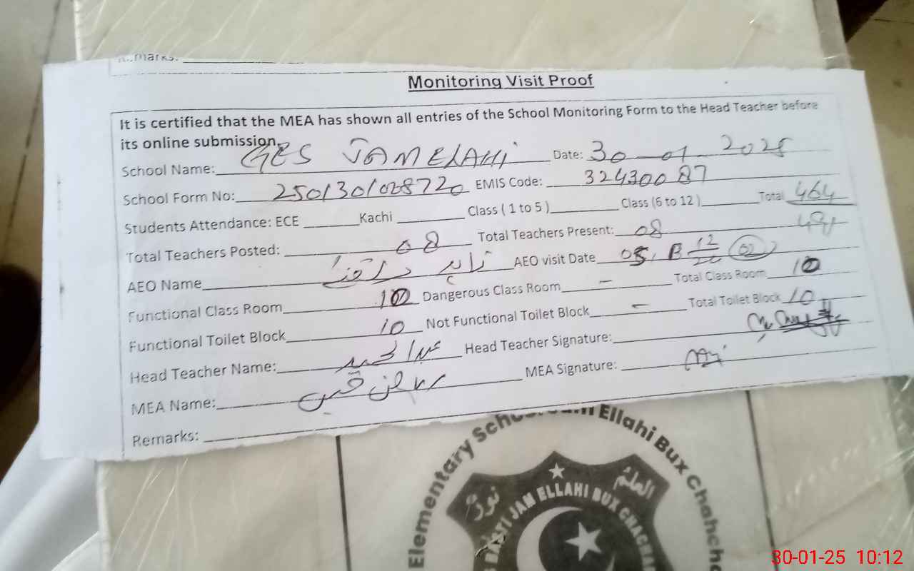 | EMIS Code: 32430087 | Name of School: GES BASTI JAM ELLAHI BUX CHACHAR | |||