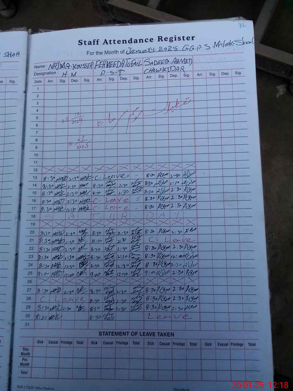 | 31**** | Sa**** Ah**** | CHOWKIDAR | 2 | 0 | 0 | 0 | 0 | 0 | 0 | 0 | 2 | Casual | |