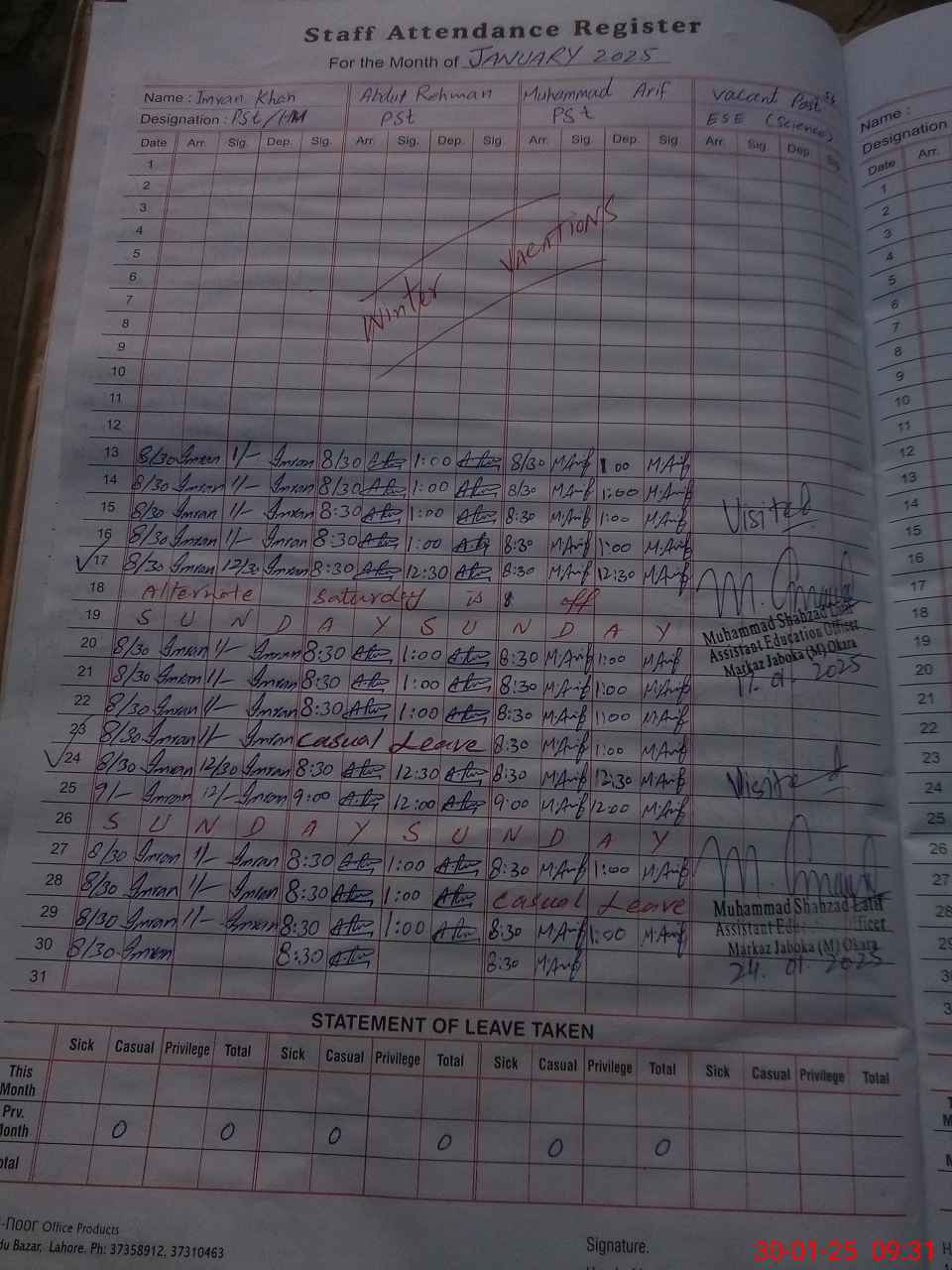 | CNIC | Full Name | Designation | R/C | Absence During Last Calender Month |