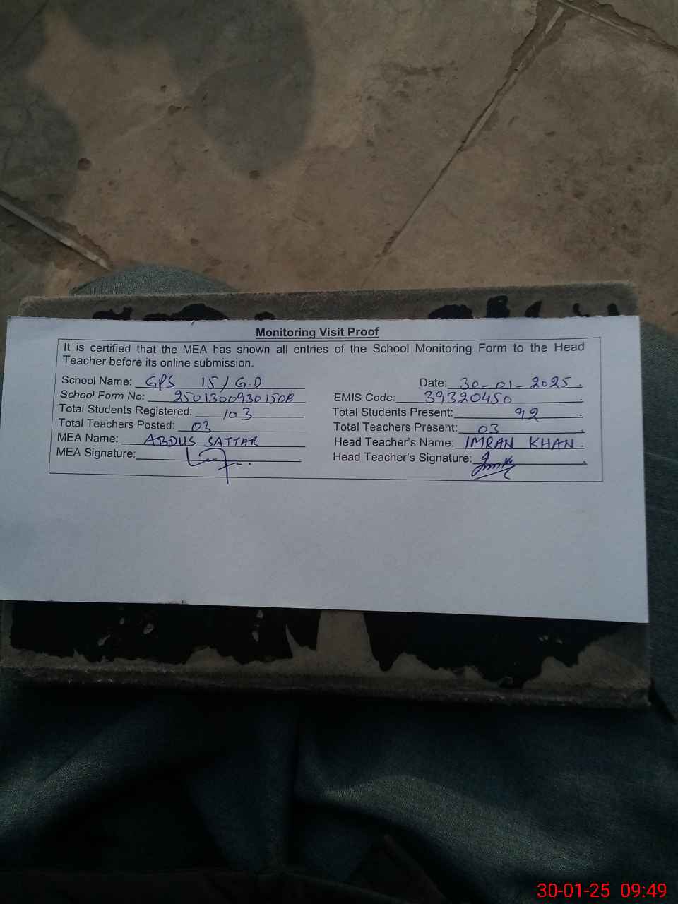 | Attendance Register | Head Teacher | MEA with School | Visit Proof |