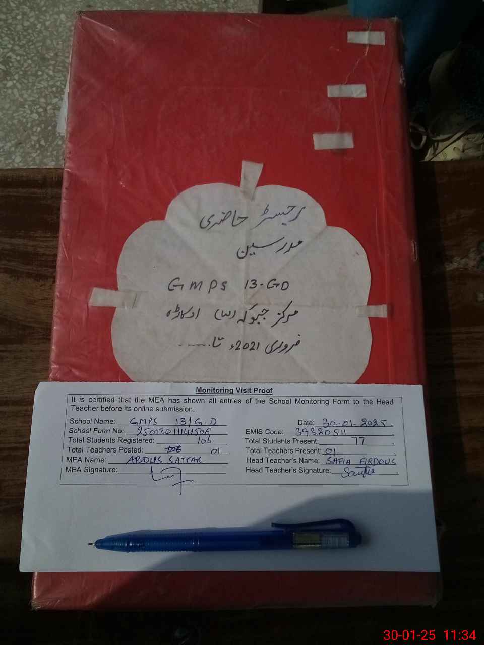 | Attendance Register | Head Teacher | MEA with School | Visit Proof |