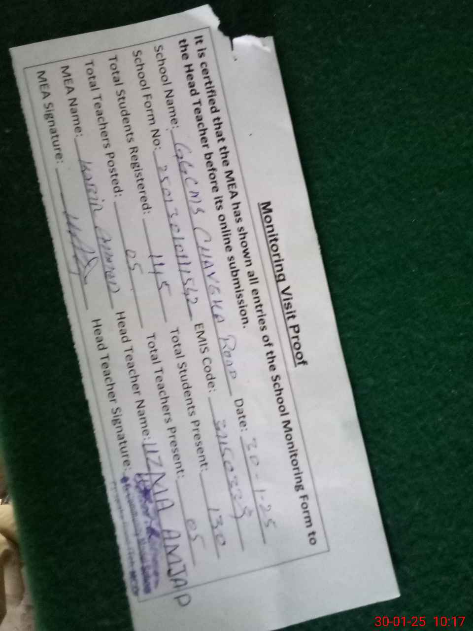 | Attendance Register | Head Teacher | MEA with School | Visit Proof |