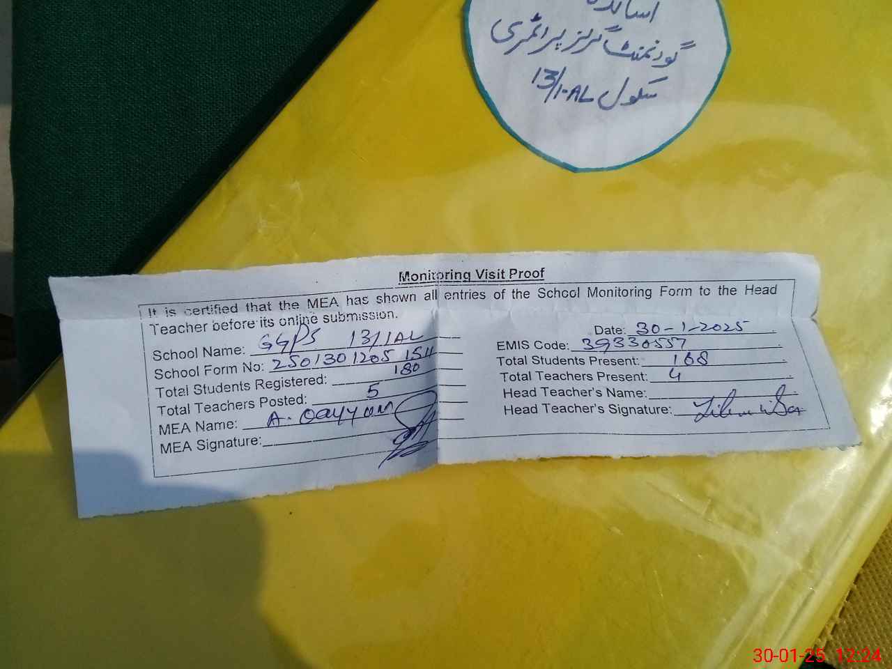 | Attendance Register | Head Teacher | MEA with School | Visit Proof |