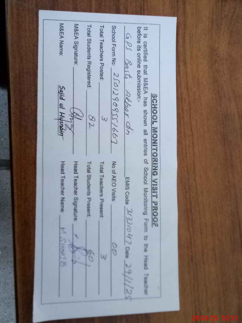 | Attendance Register | Head Teacher | MEA with School | Visit Proof |