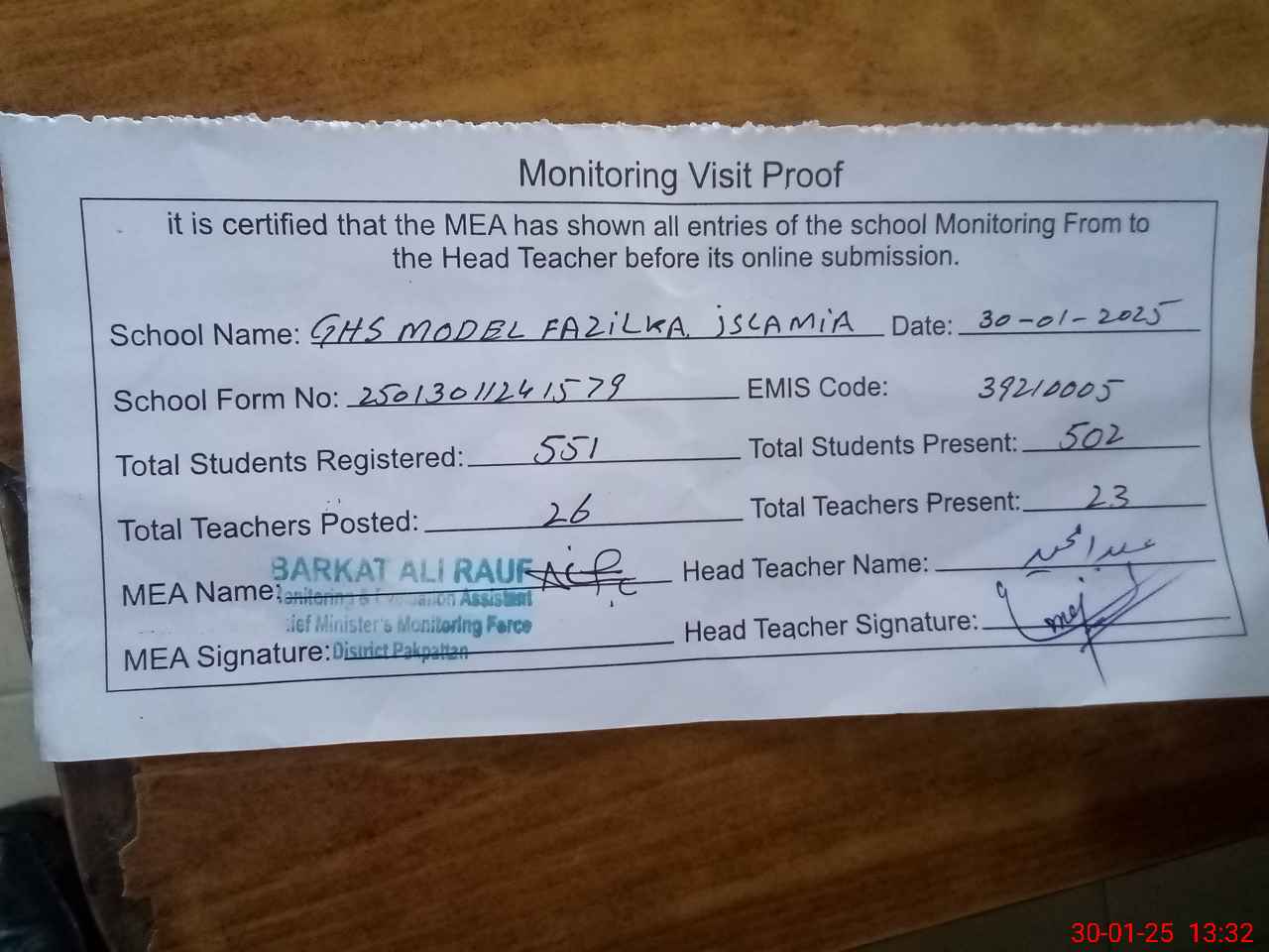 | EMIS Code: 39210005 | Name of School: GHS (MODEL) FAZILKA ISLAMIA PAKPATTAN | |||