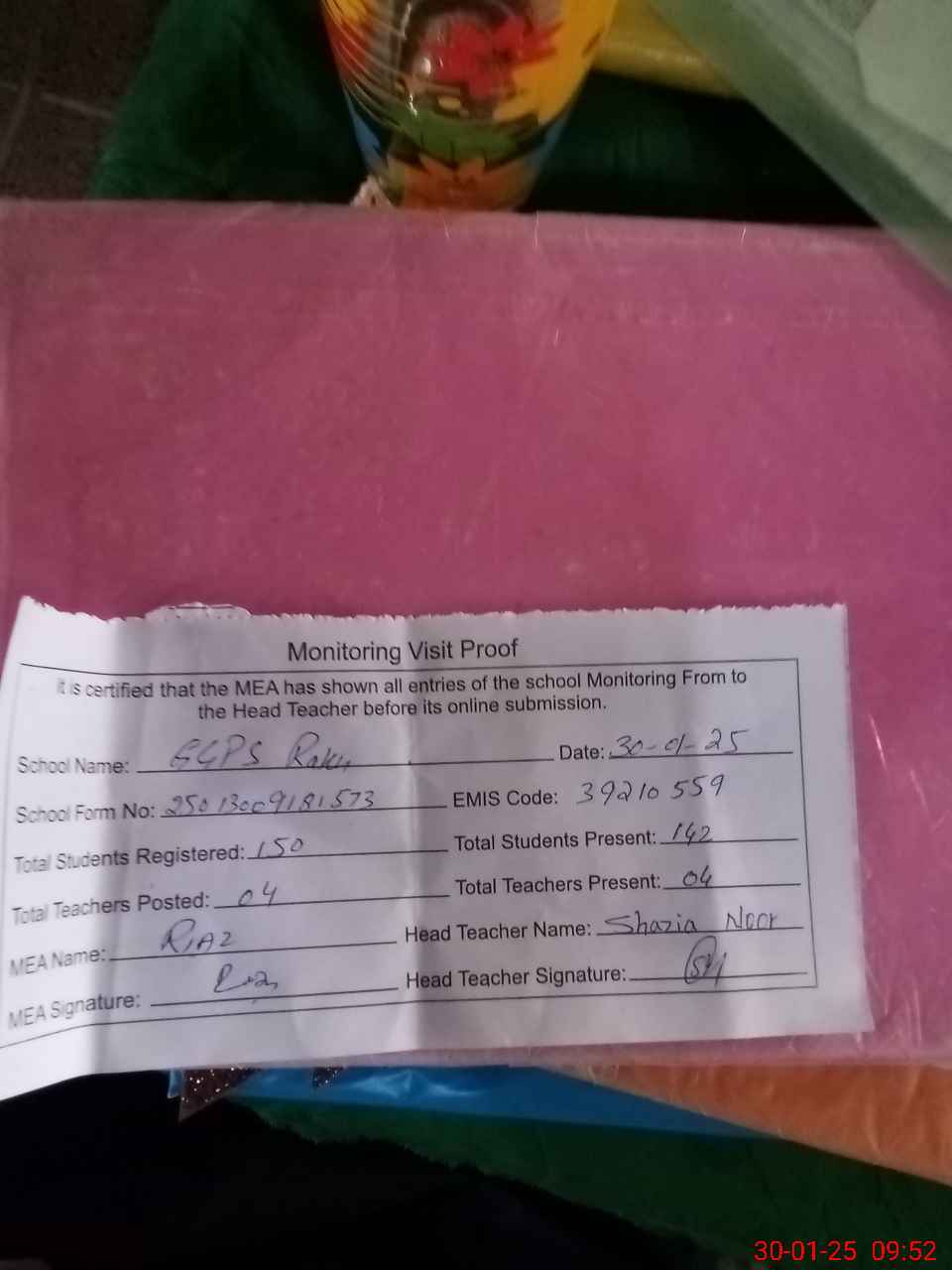 | Attendance Register | Head Teacher | MEA with School | Visit Proof |