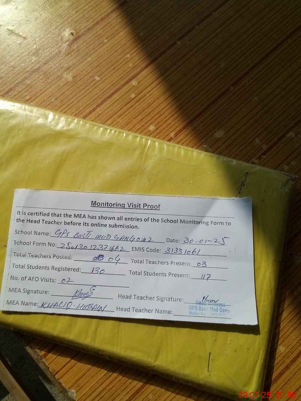 | Attendance Register | Head Teacher | MEA with School | Visit Proof |