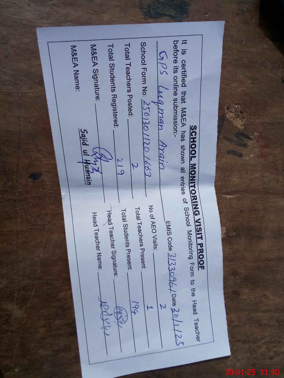 | EMIS Code: 31330961 | Name of School: GPS LUQMAN ARAIN | |||