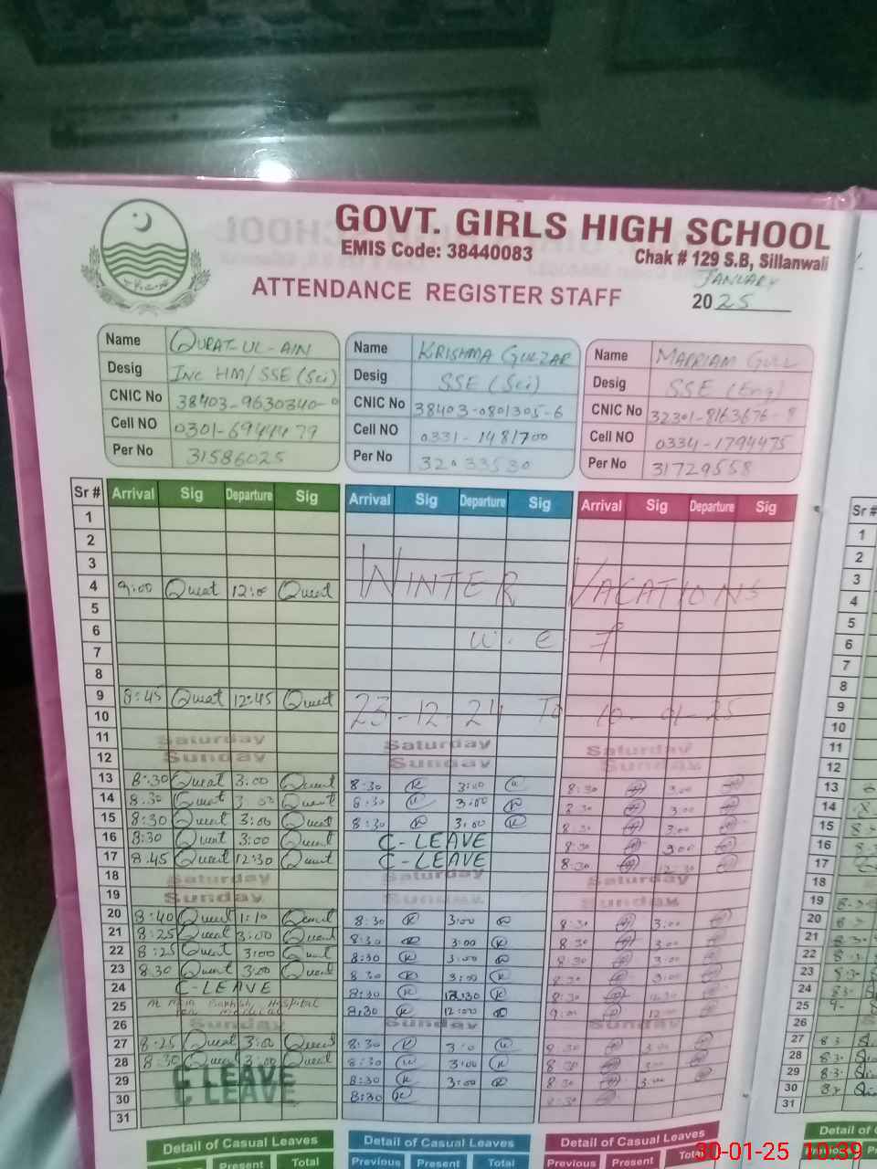 | CNIC | Full Name | Designation | R/C | Absence during last cal. month |