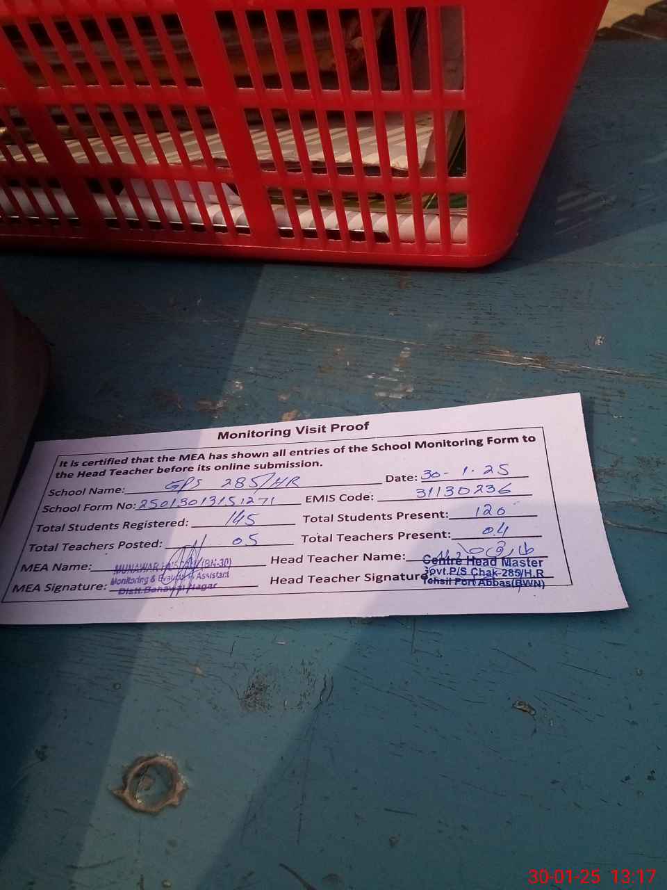 | Attendance Register | Head Teacher | MEA with School | Visit Proof |